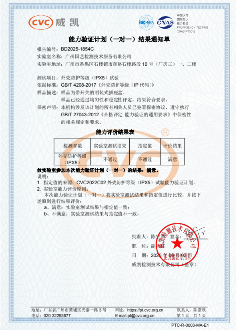 2025年5月,廣州國藝檢測技術(shù)服務(wù)有限公司(簡稱國藝檢測)與威凱檢測技術(shù)有限公司進(jìn)行了GB /T4208-2017《外殼防護(hù)等級(IP代碼)》項目能力驗證計劃(一對一)比對。國藝檢測嚴(yán)格按照《外殼防護(hù)等級(IPX5)試驗?zāi)芰︱炞C計劃(一對一)作業(yè)指導(dǎo)書》、進(jìn)行了檢測并形成試驗報告,最終的對比結(jié)果為滿意。