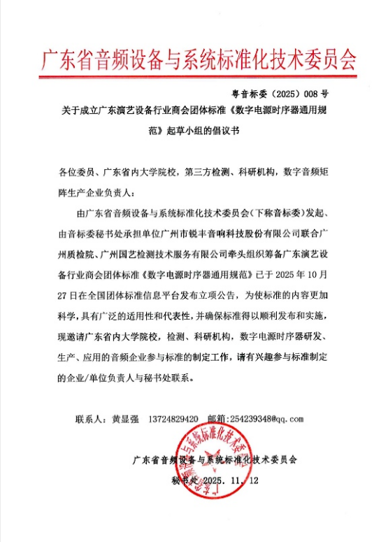 由廣東省音頻設(shè)備與系統(tǒng)標(biāo)準(zhǔn)化技術(shù)委員會(huì)(下稱(chēng)音標(biāo)委)發(fā)起、由中國(guó)賽寶實(shí)驗(yàn)室、賽西(深圳)電子信息產(chǎn)品標(biāo)準(zhǔn)化工程中心有限公司、廣州質(zhì)檢院、廣東省中南聲像燈光設(shè)計(jì)研究院、廣州市銳豐音響科技股份有限公司、深圳市東微智能科技有限公司、廣東保倫電子股份有限公司、廣州國(guó)藝檢測(cè)技術(shù)服務(wù)有限公司牽頭組織籌備廣東演藝設(shè)備行業(yè)商會(huì)團(tuán)體標(biāo)準(zhǔn)《數(shù)字音頻矩陣通用規(guī)范》、《數(shù)字電源時(shí)序器通用規(guī)范》已于2025年10月27日在全國(guó)團(tuán)體標(biāo)準(zhǔn)信息平臺(tái)發(fā)布立項(xiàng)公告,為使標(biāo)準(zhǔn)的內(nèi)容更加科學(xué),具有廣泛的適用性和代表性,并確保標(biāo)準(zhǔn)得以順利發(fā)布和實(shí)施,現(xiàn)邀請(qǐng)廣東省內(nèi)大學(xué)院校,檢測(cè)、科研機(jī)構(gòu),數(shù)字音頻矩陣/數(shù)字電源時(shí)序器產(chǎn)品研發(fā)、生產(chǎn)、應(yīng)用的音頻企業(yè)參與標(biāo)準(zhǔn)的制定工作,請(qǐng)有興趣參與標(biāo)準(zhǔn)制定的企業(yè)/單位負(fù)責(zé)人與秘書(shū)處聯(lián)系。